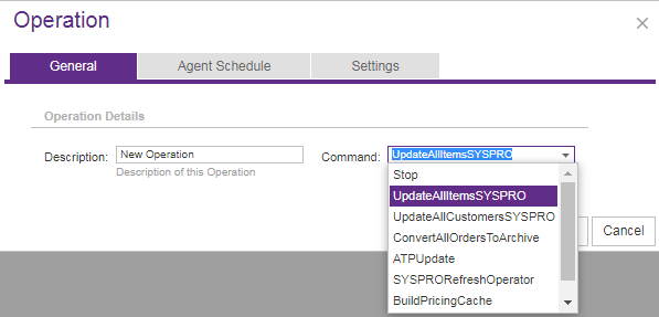 New to CyberStore, and released in version 2.15, the Operation Agent provides a service able to perform certain CyberStore tasks (or Operations) on demand, or on a schedule, utilizing a separate application space. Operations are designed to conduct background processing of complex routine tasks such as synchronizing certain data between SYSPRO and CyberStore.