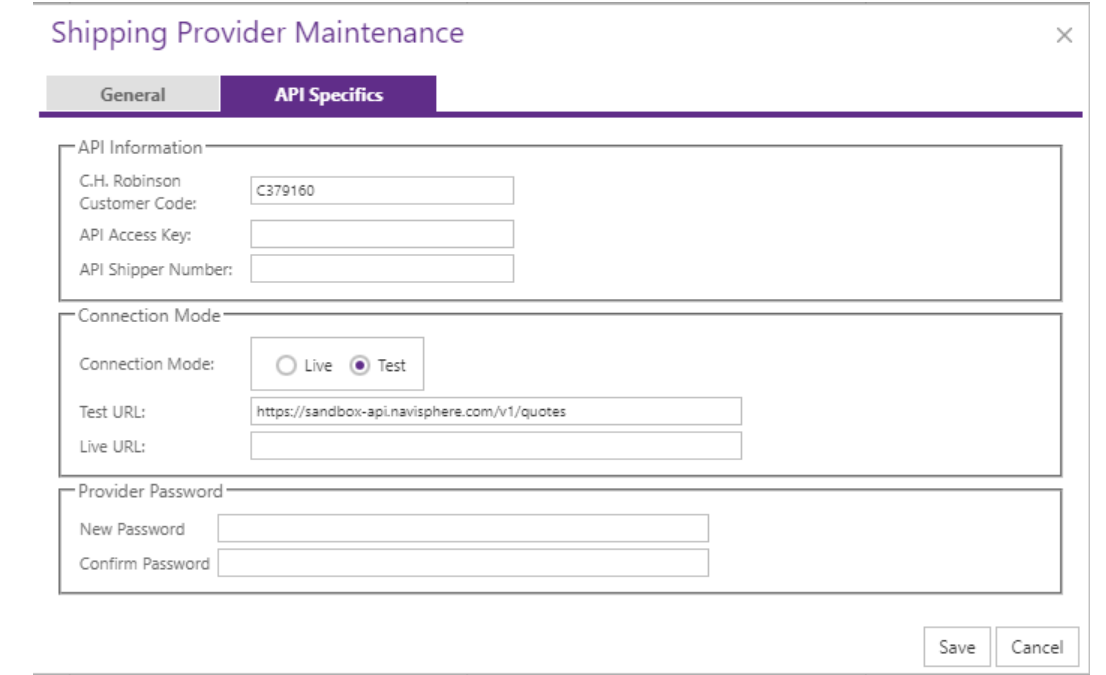 If C.H. Robinson is selected in the provider type drop down on the general tab, the label text of the 'API Username' field will change to 'C.H. Robinson Customer Code'. The customer code is a CHR defined code that is provided to the customer and is REQUIRED for valid API requests. The test URL and Live URL is also REQUIRED depending on which connection mode is selected. The current valid API URL is