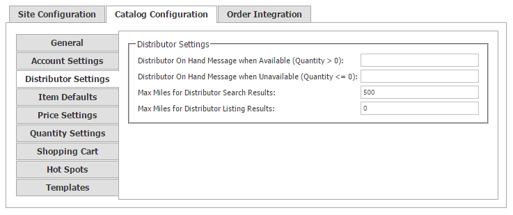 General Account Settings Distributor Settings Item Defaults Price Settings Quantity Settings Shopping Cart Hot Spots Templates