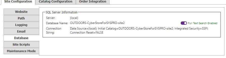 Use the Database tab to view information about the Microsoft SQL Server information for the CyberStore application. The database connection cannot be changed using the Site Configuration Manager.