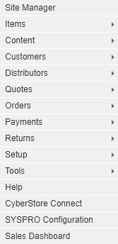 Under each general Category name, such as "Items," "Content," or "Customers," next to a right-facing arrow, you can find more detailed pages through which you can maintain those Categories within your website.