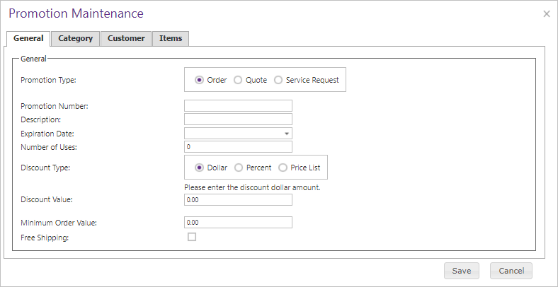 | All Items | A box that, when checked, indicates that the promotion can be applied to the purchase of any Item. |